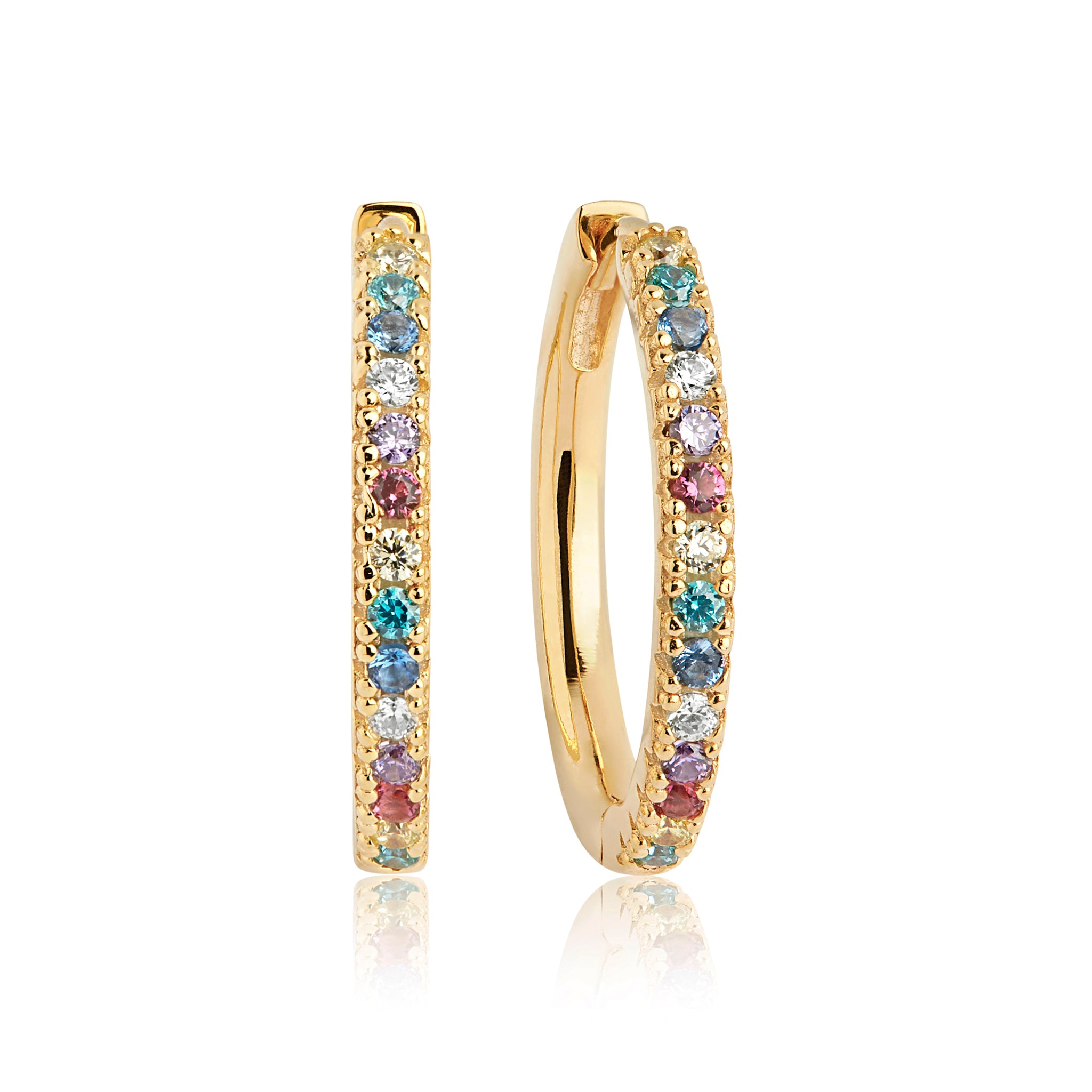 Pair of 18ct yellow gold plated sterling silver hoop earrings set with multi coloured faceted cubic zirconia.