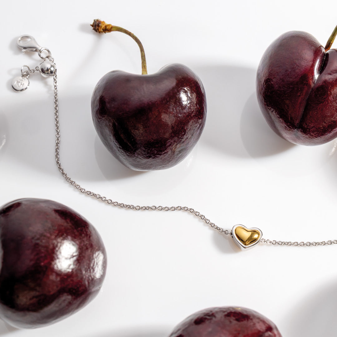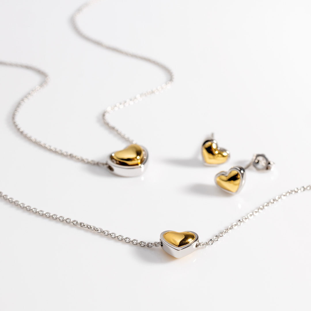 The Heart of Gold Slider bracelet is a charming sterling silver keepsake designed to celebrate someone special, featuring a delicate curved heart with an 18ct gold plate finish cradled by a sleek sterling silver outline, and an adjustable slider toggle for a perfect, comfortable fit. Its popular two-tone finish complements both silver and gold jewellery, creating a treasured piece to wear alone or as a set with the matching stud earrings and necklace.