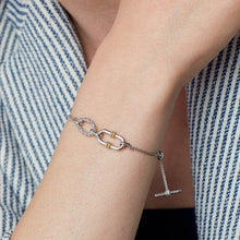 Sterling silver with 18ct yellow gold plated rope design bracelet, it fastens with a shackle clasp that has T-bar next to it as a design feature.