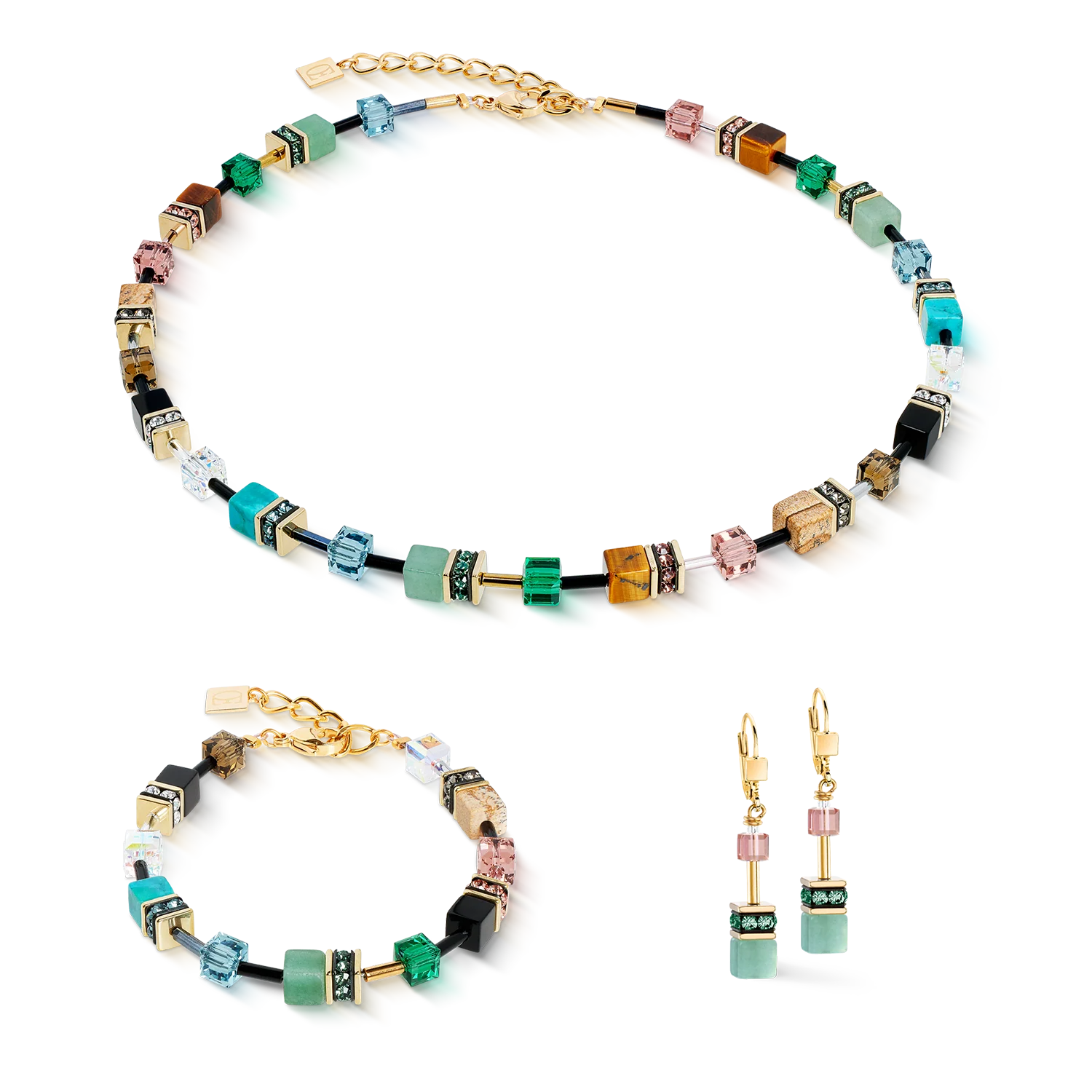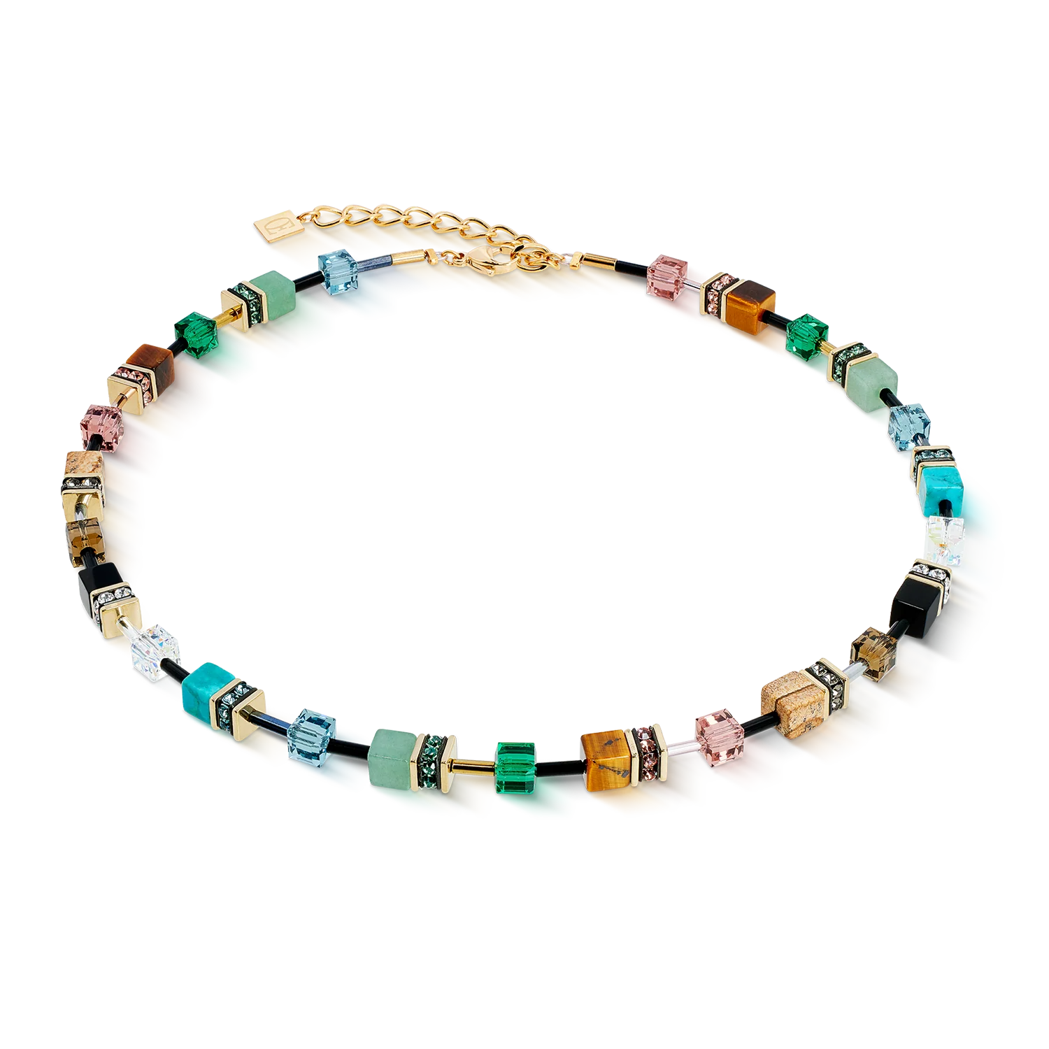 Iconic elegance with natural power - The GeoCUBE® Iconic Precious necklace Art Nouveau combines the clear design language of the iconic GeoCUBE® design with the energy of real gemstones. Turquoise stands for protection and inner peace, landscape jasper for a connection to the earth, aventurine for optimism and tiger's eye for courage and strength. Sparkling Swarovski® crystals and precious crystals add glamorous accents, while gold-plated stainless steel rounds off the design. This colour combination is reminiscent of the harmony of nature and the playful elegance of Art Nouveau - handmade in Germany.