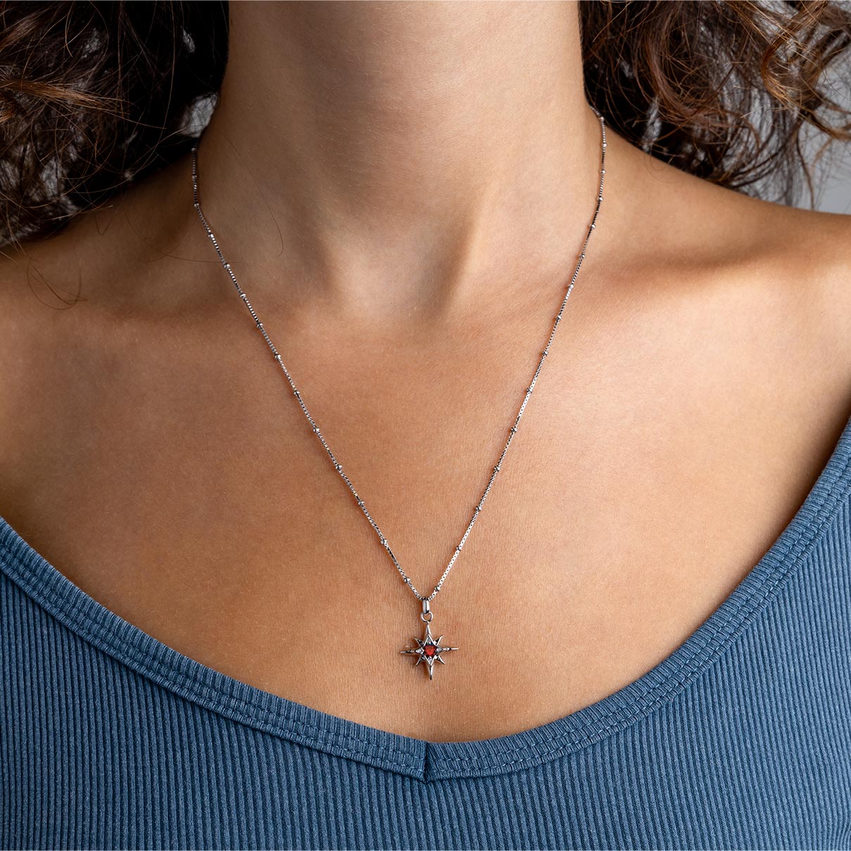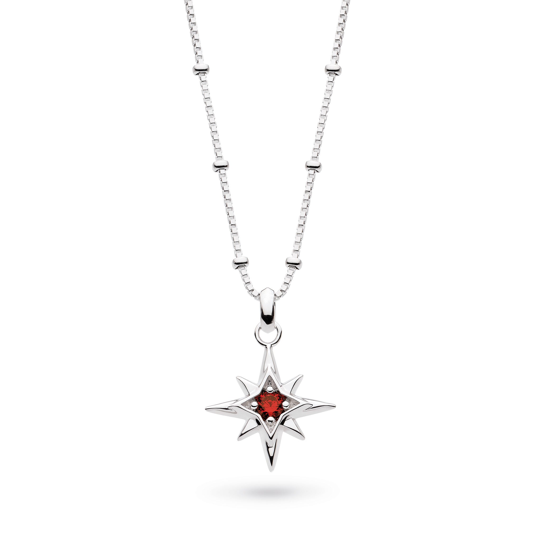 Part of Kit Heath's Céleste Aurora collection, this birthstone January necklace showcases a sterling silver 8-pointed star with a mini garnet charm.