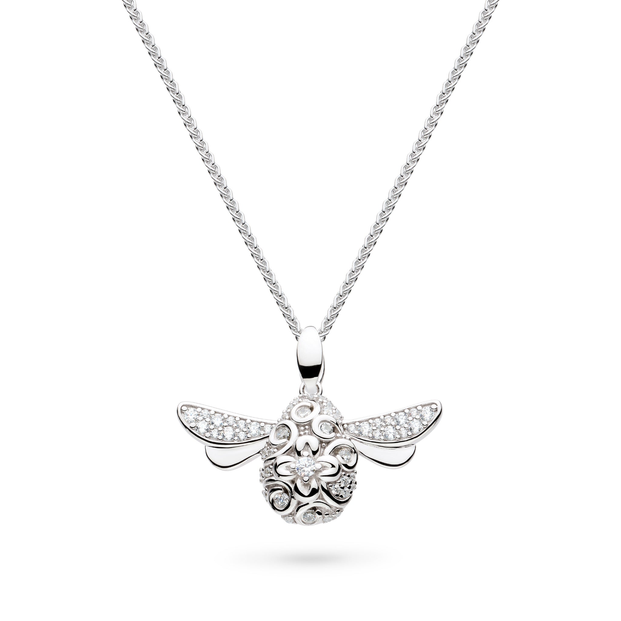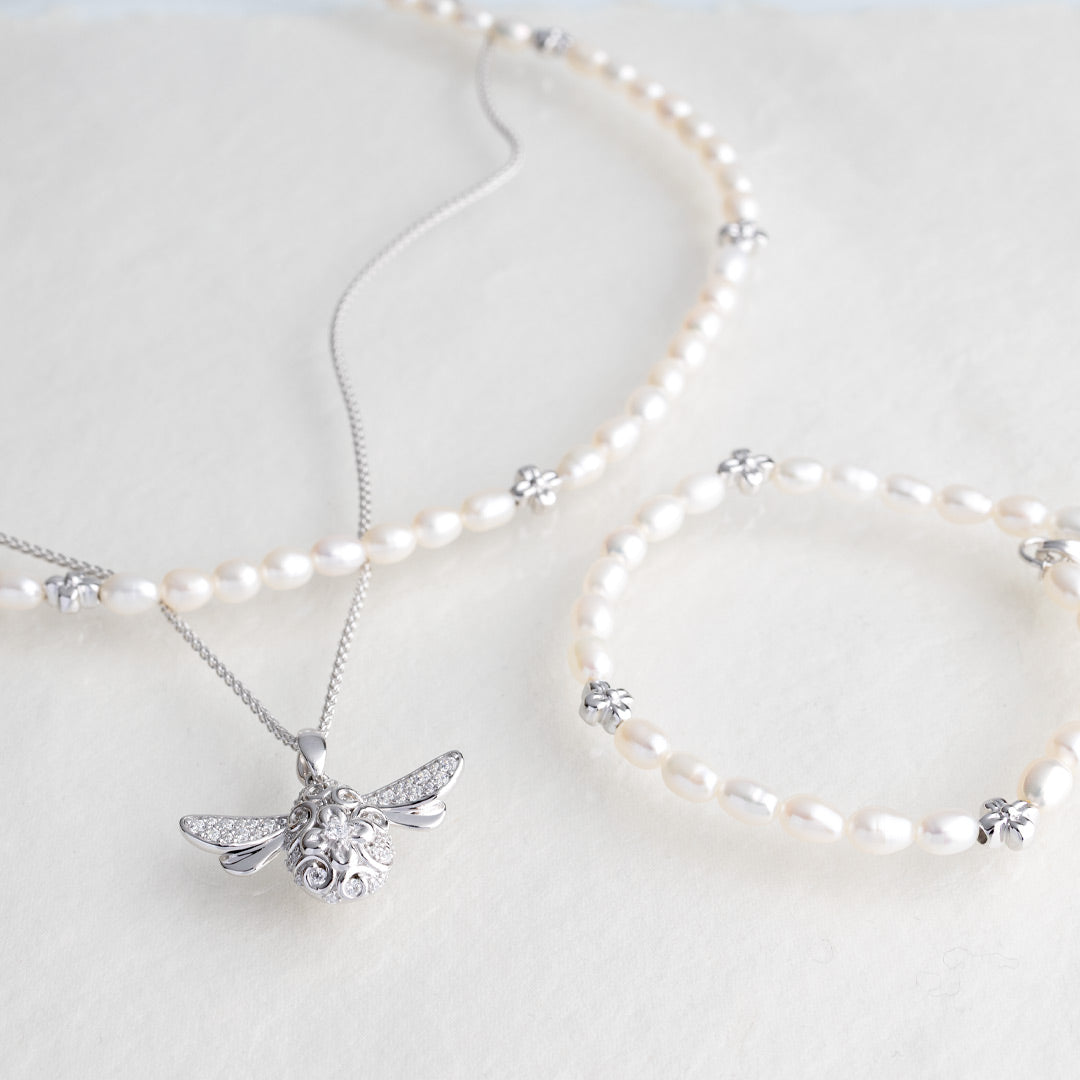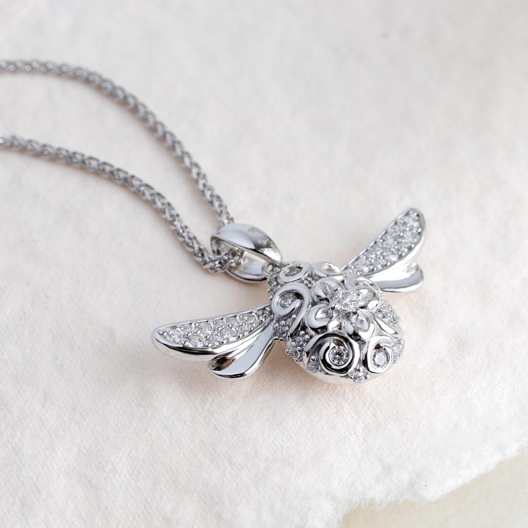The New Queen Bee Necklace - a striking tribute to the strong women in your life. Featuring a large sterling silver Queen Bee pendant on a long 20-inch chain, this statement piece glows with sparkling cubic zirconia accents on the wings and body, making it a dazzling highlight for 2026. Part of Kit Heath's Blossom collection, it celebrates the life, spirit, and transformative power of Mother Nature. Inspired by the beauty of the botanical world, the new Queen Bee is a dazzling evolution of Kit Heath's iconic original Queen Bee. With its gold-accented predecessor as inspiration, this is the most sparkling, distinctive, and eye-catching honeybee yet.