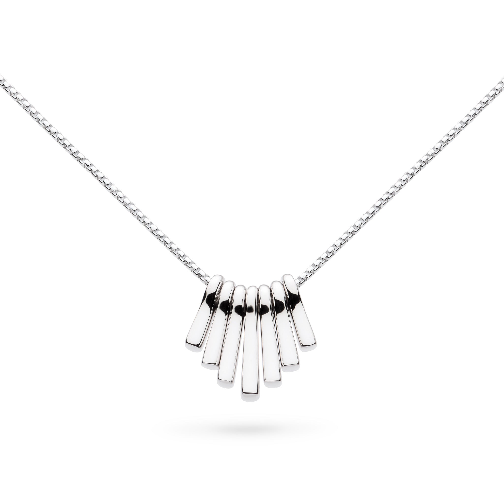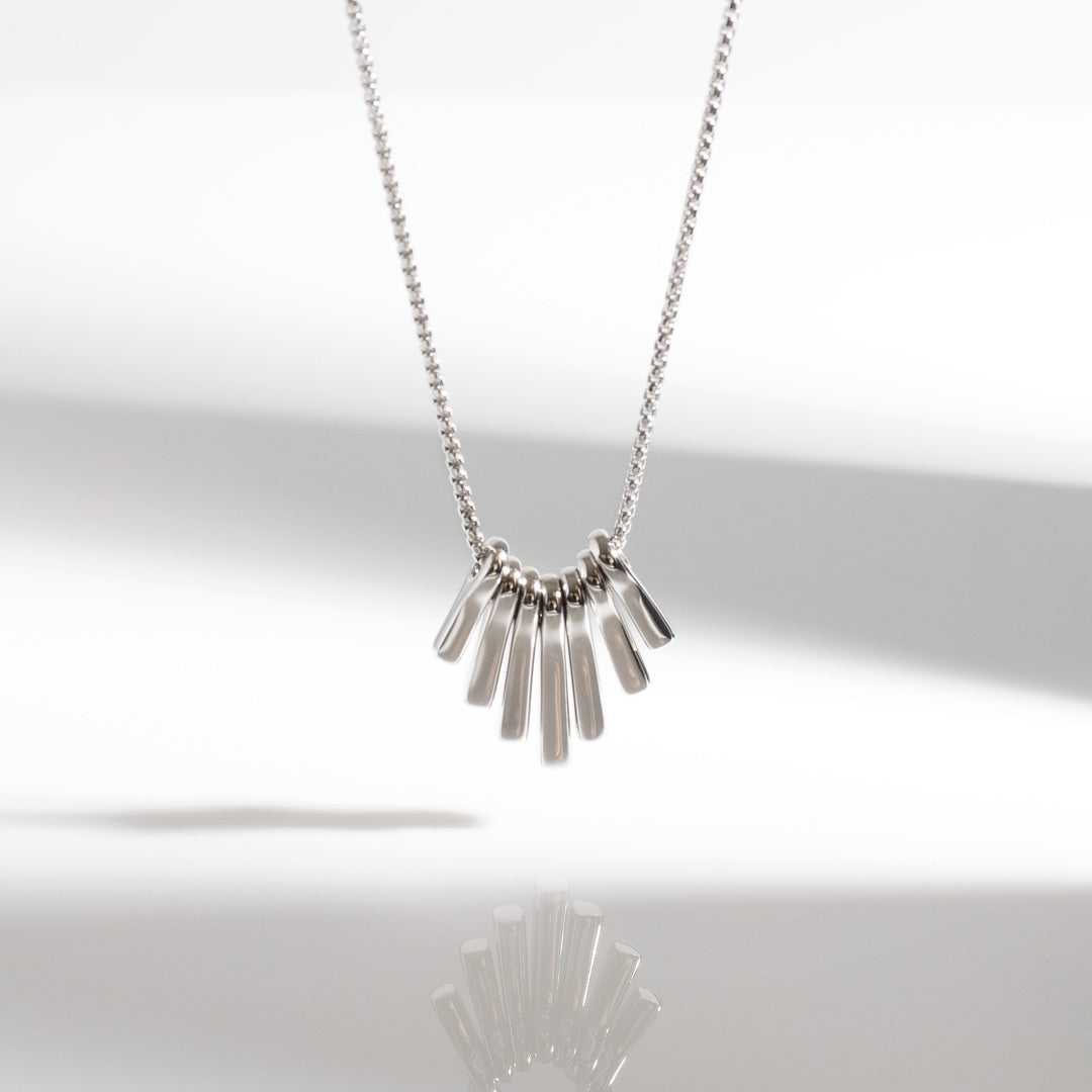 The Array Dangle 18" Necklace is a study in movement and modern form. Crafted in hand-finished sterling silver, seven independently suspended pendants in varying sizes create a soft, cascading silhouette that shifts and flows with the wearer. Each element moves freely, catching the light and adding subtle texture and depth, while the balanced composition keeps the design effortlessly wearable. Contemporary yet refined, this necklace brings a sense of fluidity and individuality to everyday styling, making it a distinctive statement with enduring appeal.