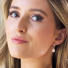 Sterling silver hoop earrings from each hoop hangs an oval fresh water pearl.